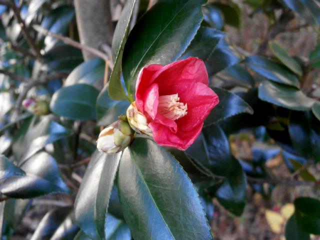 紅白の一子侘助椿、白侘助椿さらに万両の赤実、